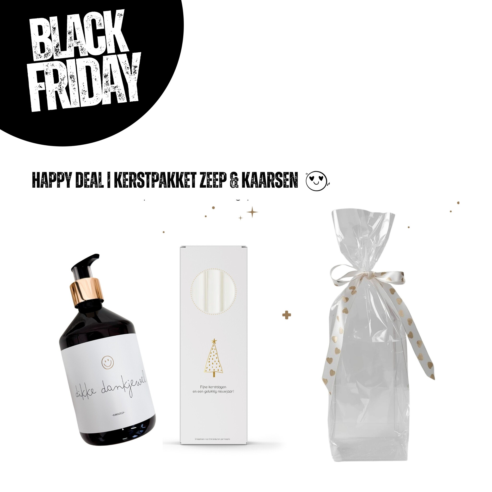 Black Friday deal: je ontvangt drie dinerkaarsen in geschenkdoos en een handzeep met de tekst 'Dikke dankjewel', samen verpakt in cellofaan met strik.