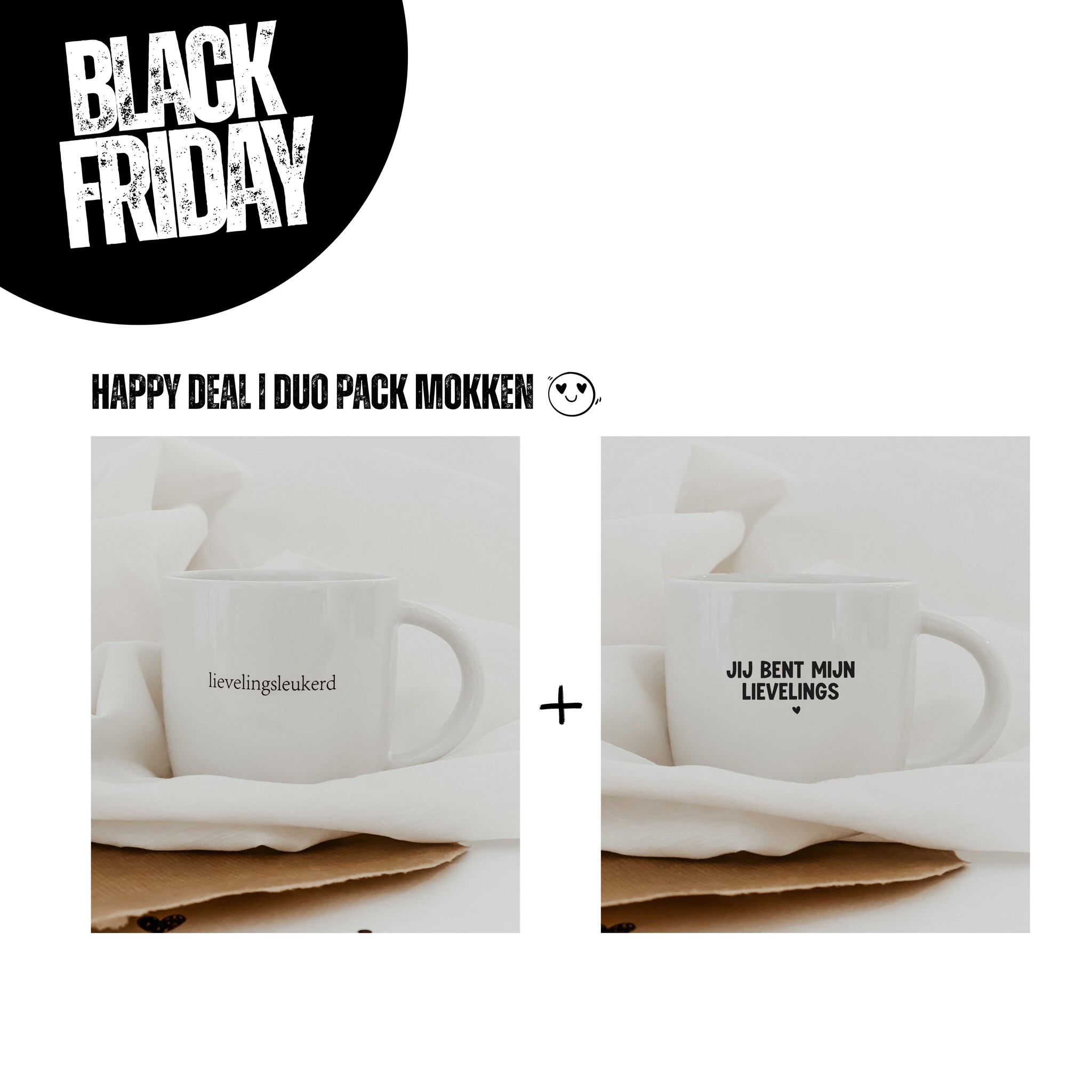Black Friday deal: je ontvangt deze twee mooie mokken op de foto met de tekst 'lievelingsleukerd' en 'jij bent mijn lievelings'.