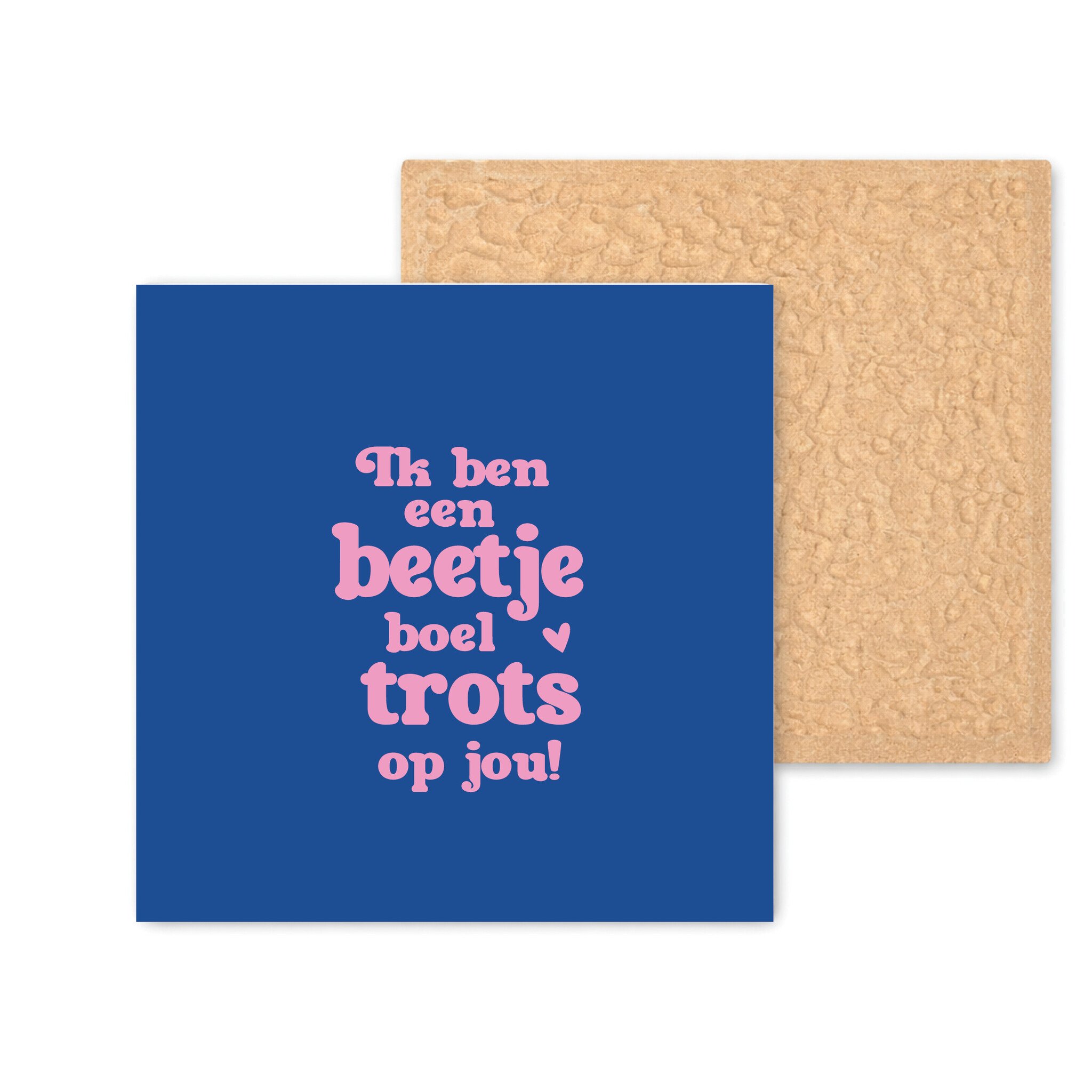 Het formaat is 11 × 11 centimeter en hebben een dikte van ca 6MM. Perfect om neer te zetten op een plank, bureau of dressoir, of om cadeau te geven aan iemand die je lief vindt. Wil je het tegeltje mooi neerzetten? Dan kun je een losse tegelhouder erbij bestellen, zodat het tegeltje altijd goed tot zijn recht komt.