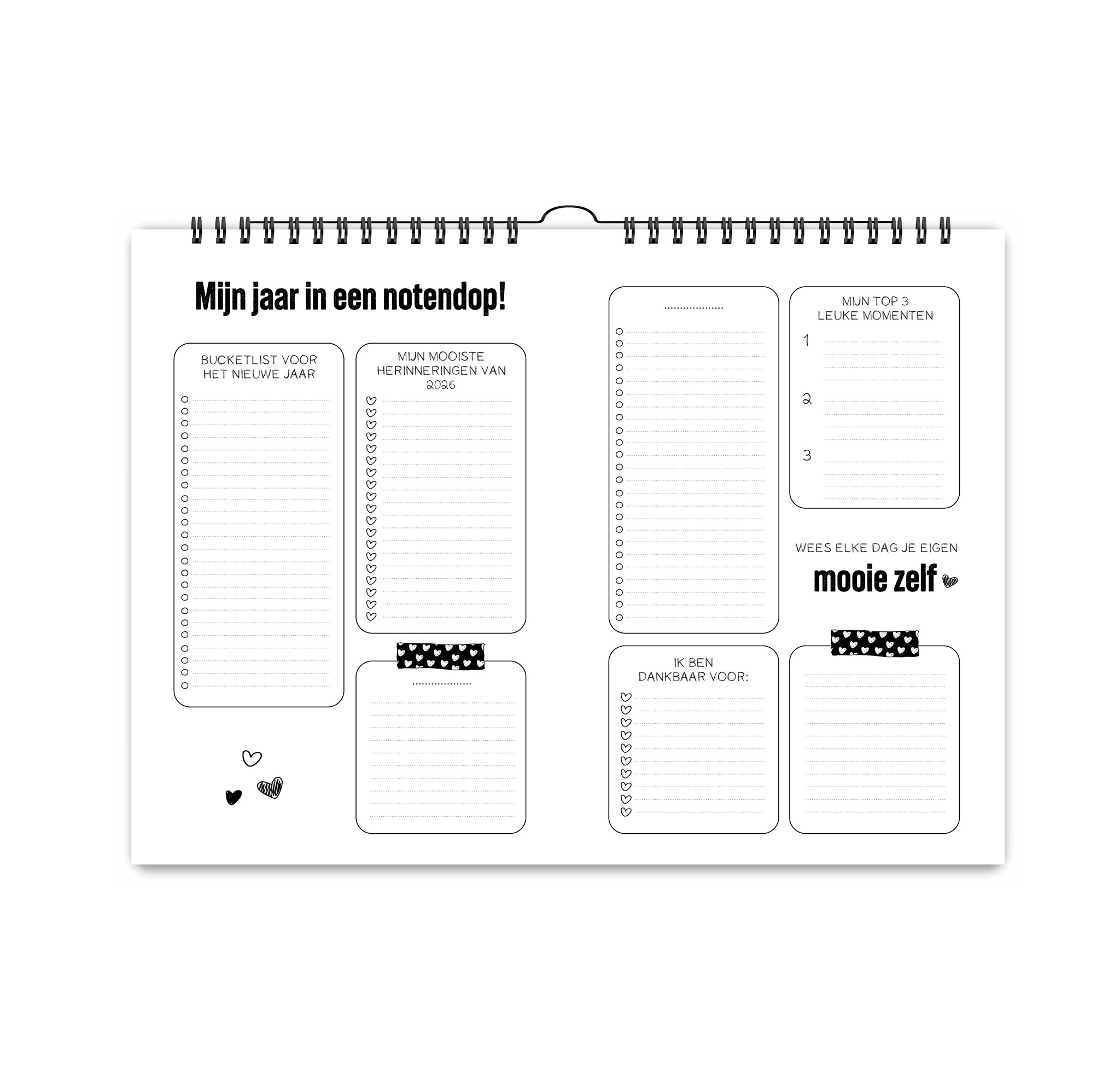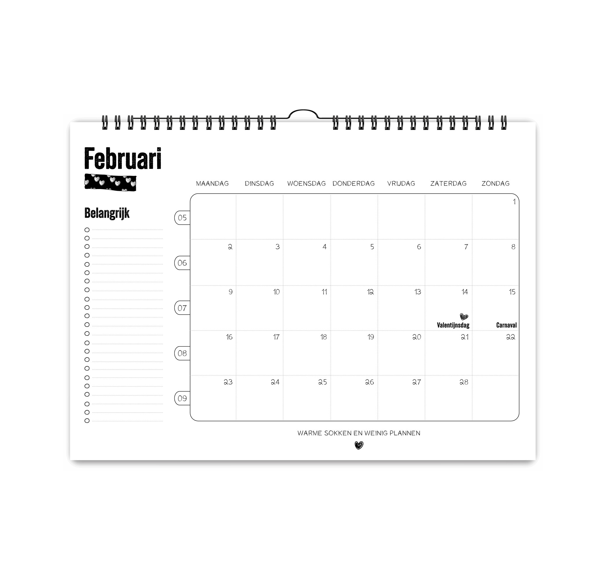 Hij is er weer! De maandkalender voor 2026. Deze grote A3 kalender is voorzien van 12 maanden en een leuk invulblad. Elke maand is voorzien van weeknummers en een veld voor notities. Tevens zijn alle feestdagen al voor je ingevuld.