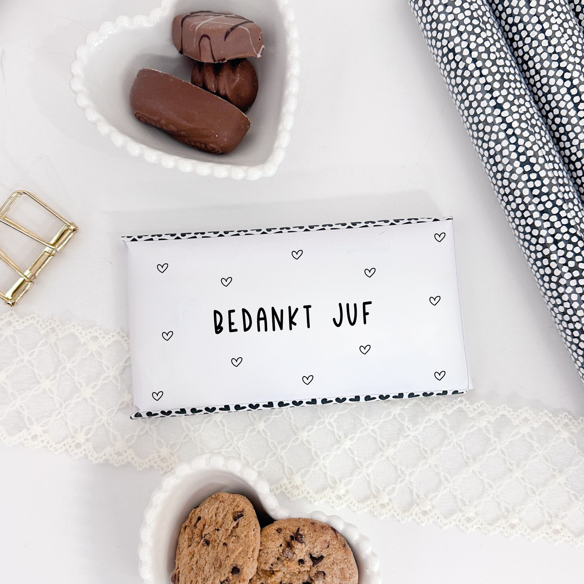 Wij printen de wikkel al voor je uit én leveren de chocoladereep direct mee. Jij hoeft alleen nog maar samen met je kindje de printable uit te knippen en op de achterkant een lieve boodschap te schrijven voor de juf of meester.